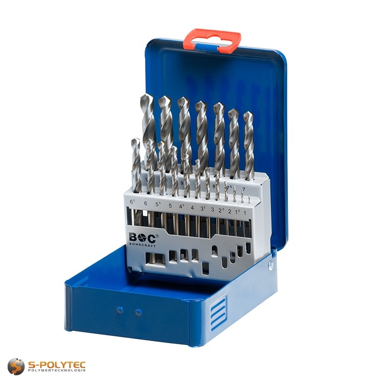 De negentien nauwkeurige HSS-G-boren zijn verzameld in een slijtvaste industriële cassette van stevig metaal. Hierdoor zijn ze altijd overzichtelijk gerangschikt en beschermd tegen stoten. Bovendien kunnen de boren eenvoudig uit de uitsparingen worden gepakt zonder het risico zich te verwonden aan de extreem scherpe randen. De handige cassette heeft afmetingen van ca. 15,0 x 11,0 x 3,5cm en kan daardoor gemakkelijk vervoerd of opgeborgen worden in een gereedschapskoffer.