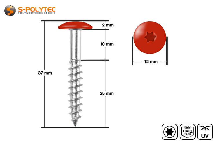 De rode schroeven met een kopdiameter van 12mm zijn vervaardigd volgens de DIN EN 14592 norm. Dit betekent dat de schroeven voldoen aan de algemene typegoedkeuring voor geventileerde gevelsystemen met Trespa® Meteon® FR-platen van hogedruklaminaat en gebruikt kunnen worden voor de bevestiging van verticale gevelbekleding op houten steunlatten.