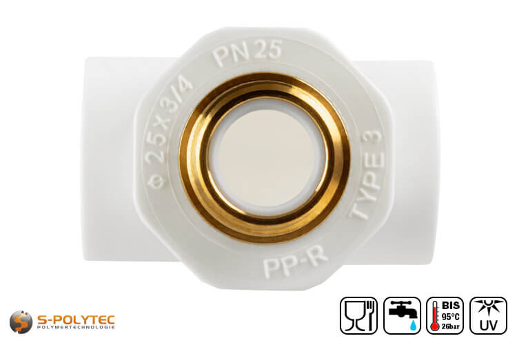 Onze PP-R T-stukken zijn gemaakt van wit polypropyleen random copolymeer en hoogwaardig messing. Polypropyleen wordt gekenmerkt door een zeer goede slagvastheid en is als voedselveilige kunststof ook goedgekeurd voor gebruik als drinkwaterleiding. Voor dit toepassingsgebied gelden strenge normen, zodat het gebruik ervan wordt getest en gecertificeerd door SKZ en DVGW. De zeer goede chemische weerstand van de kunststof, alsmede de temperatuurbestendigheid van -10°C tot +95°C, maken het ook mogelijk de kunststof te gebruiken als verwarmings- en aircobuis.